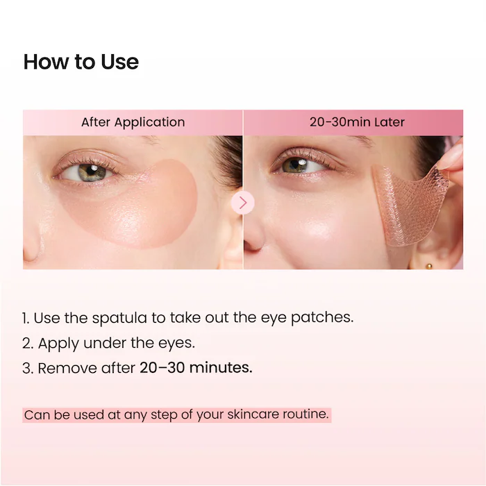 لاصقات تحت العين تحتوي على الكولاجين والببتيدات، تعمل على شدّ البشرة بشكل ملحوظ، وتنشيطها، ومنح منطقة تحت العين امتلاءً وحيوية.