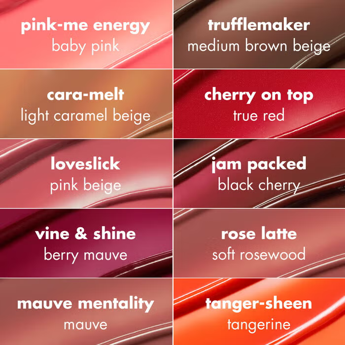 | Color | Cara-melt, Cherry On Top, Jam Packed, Loveslick, Mauve Mentality, Pink-Me Energy, Rose Latte, Trufflemaker, Vine & Shine |