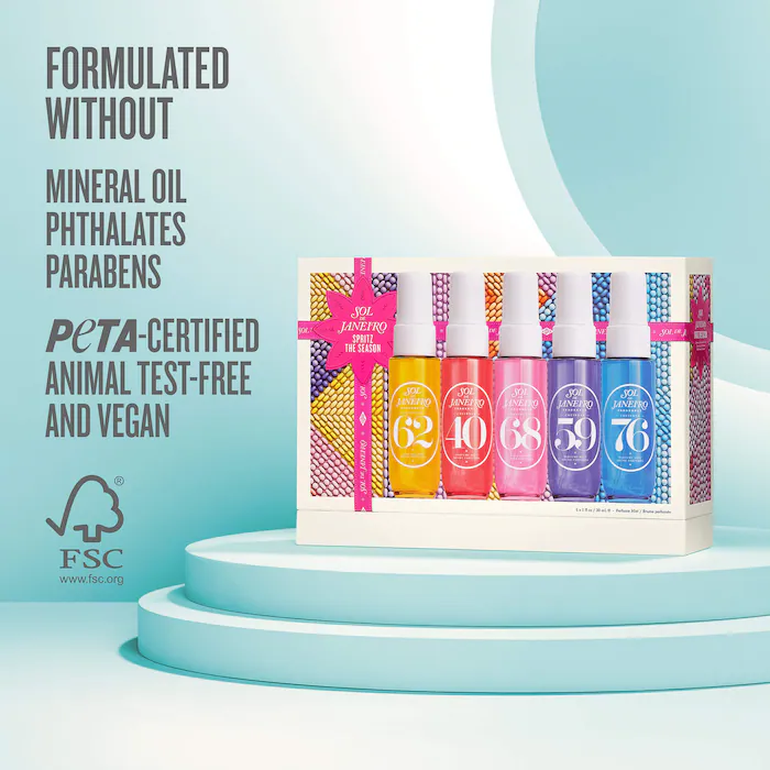 Set Description: The Perfume Mist Collection includes five of Sol de Janeiro’s most-wanted fragrances that you can wear solo or layer for a scent experience that’s 100 percent your own. Enjoy Cheirosa 62, Cheirosa 68, Cheirosa 59, Cheirosa 76, and Cheirosa 40.